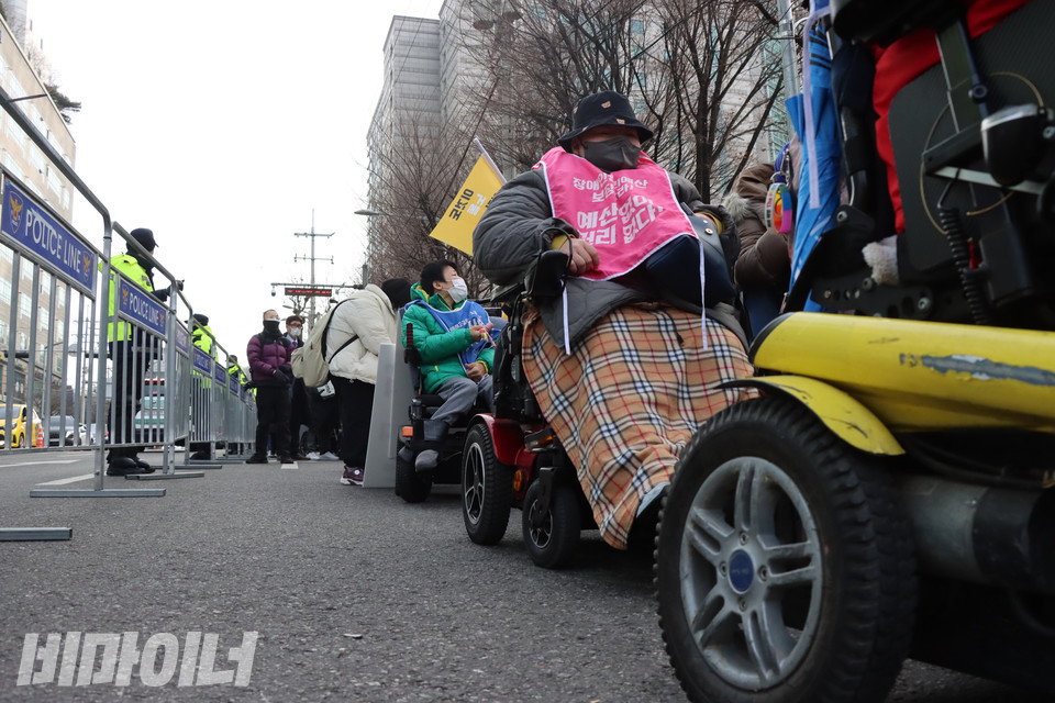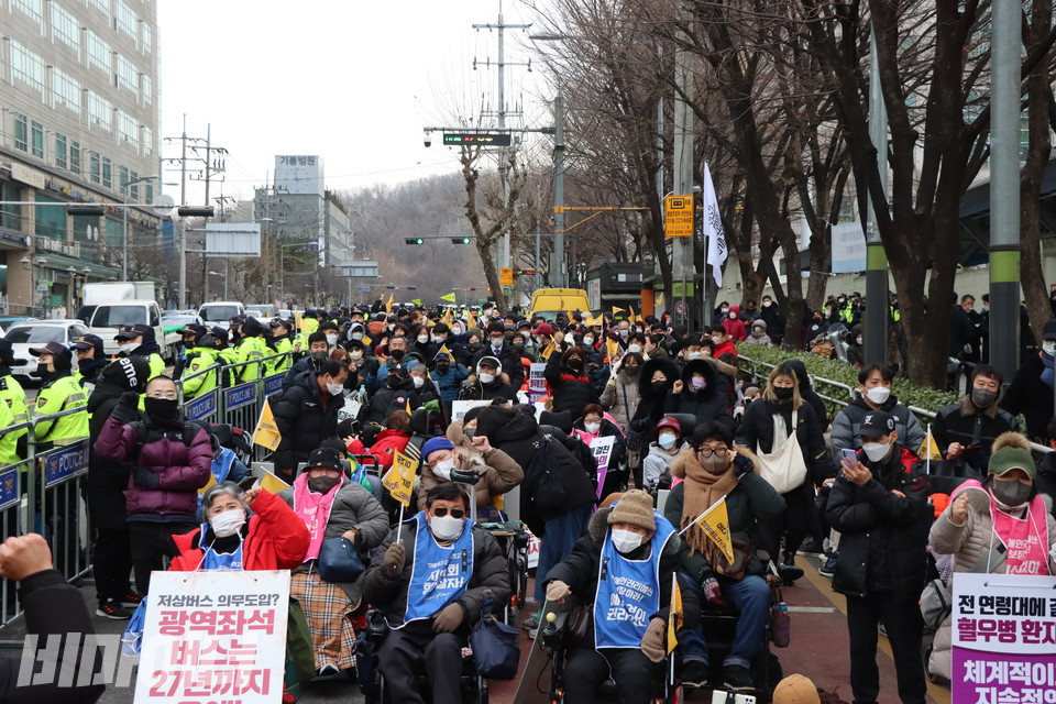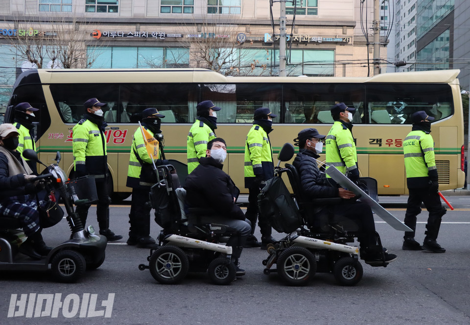 2014년 1월 설을 앞두고 장애인들이 서울고속버스터미널을 점거하며 투쟁을 벌인 지 10년이 다 되어간다. 승차권이 있어도 버스에 탈 수 없는 장애인들은 이날 승강장 대신 거리로 쏟아져 나와 다시 한번 장애인 시외이동권 보장을 요구했다. 전동휠체어를 이용하는 문경희 세종장애인차별철폐연대 공동대표가 도보 행진에 앞서 외쳤다.