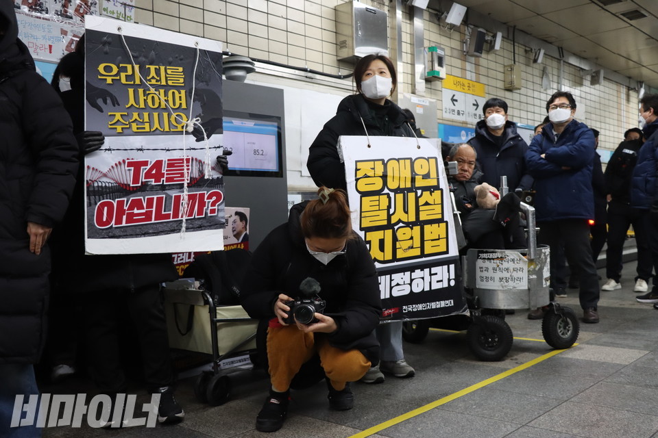 전장연은 올해 1월 2일, 48차 ‘출근길 지하철 탑니다’를 하려고 했으나 서울교통공사·서울시의 ‘무정차’ 대응으로 지하철에 탑승하지 못했습니다. 장애인 권리를 무정차하는 정부를 규탄하며 전장연은 매일 아침 8시, 혜화역 승강장에서 시민들에게 권리예산과 입법을 알리는 선전전을 합니다. 비마이너는 꾸준한 매일의 투쟁을 꾸준하게 기록하고자 합니다. 같으면서도 다른 어제와 오늘을 사진과 글로 전합니다.