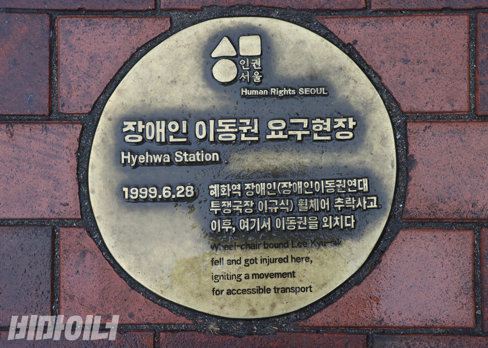 8시 7분, 박경석이 280일 차 선전전을 시작하며 혜화역 엘리베이터의 유래를 설명한다. “1999년 어느 날 이규식 서울장애인차별철폐연대 대표가 혜화역에서 리프트를 타다 떨어져 사망… 아니 크게 다쳤습니다. 아직 살아계시고요, 그때 전치 4주 중상을 입었습니다. 그 추락사고가 장애인 이동권 투쟁을 촉발했습니다. 혜화역 2번 출구로 나가면 ‘혜화역 장애인 휠체어 추락사고 이후, 여기서 이동권을 외치다’라고 적힌 동판이 있습니다. 서울지하철 역사 가운데 가장 먼저 엘리베이터가 생긴 곳이 바로 혜화역입니다.”