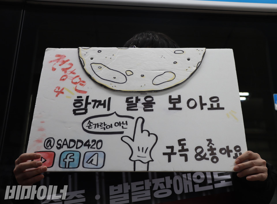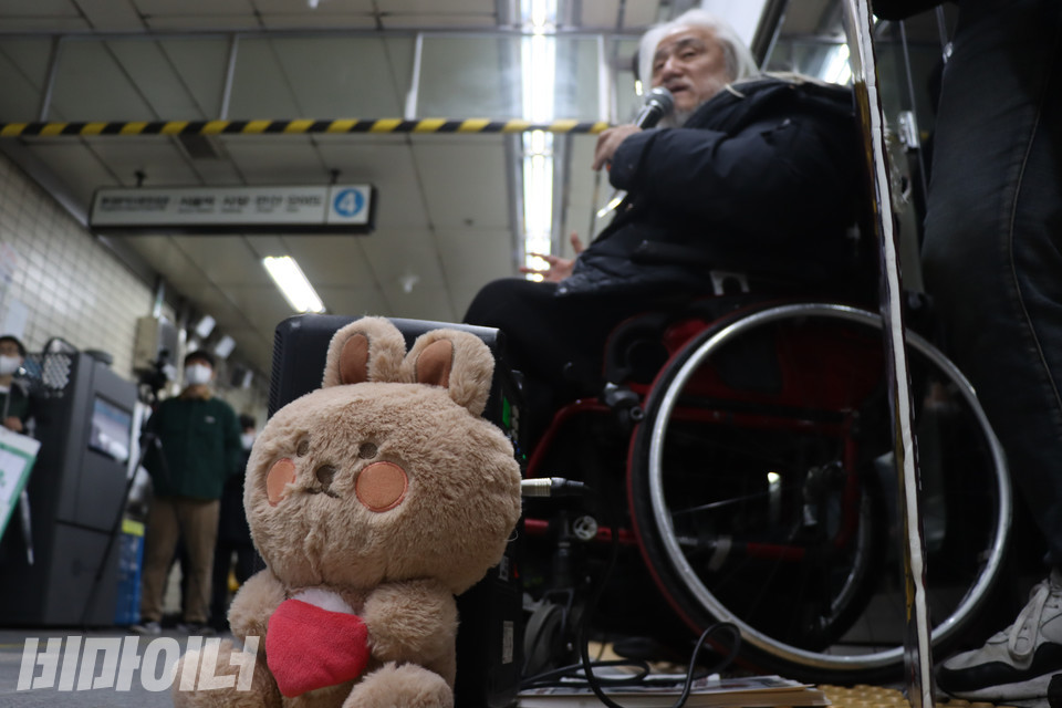 박경석 전장연 상임공동대표가 선전전 참가자들에게 연신 인사를 건넨다. “안쪽으로 들어오세요. 사람들 더 올 거라서요.” 혜화역 승강장 5-3과 5-4 사이, 박경석의 휠체어가 우두커니 멈춰 선다. 왼쪽에는 휴대용 마이크 앰프와 토끼 인형 두 개가, 오른쪽에는 ‘전장연과 함께 달을 보아요’라고 적힌 문구와 함께 손가락이 달을 가리키는 그림이 놓여 있다. 오전 8시께 문애린 이음장애인자립생활센터 소장이 차가운 아침 공기를 가르며 승강장으로 들어온다. 입꼬리를 힘껏 끌어올리며 반짝이는 눈으로 그가 웃어 보인다.
