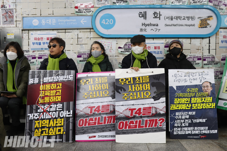 전국장애인차별철폐연대(아래 전장연) 활동가들은 2021년 12월 6일부터 혜화역 승강장 5-4(동대문역사문화공원역 방면)에서 장애인권리예산·입법 쟁취를 위한 선전전을 하고 있습니다. 전장연은 지난해 47차례 ‘출근길 지하철 탑니다’를 진행하고, 141일 동안(3월 30일~12월 1일) 177명의 장애인·비장애인 활동가들이 삭발 투쟁을 했습니다. 그러나 올해 장애인권리예산은 정부 예산안에 반영된 자연증가분을 제외하면, 국회에서는 고작 1.1%만 증액됐습니다. 기획재정부가 예산 증액에 반대했기 때문입니다.