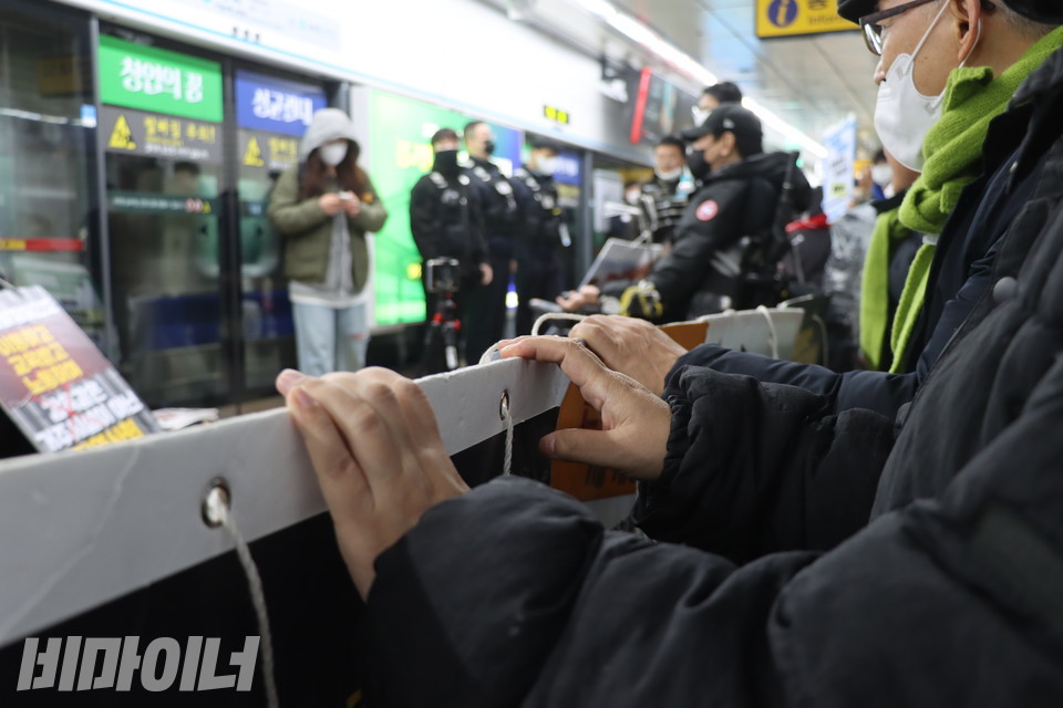전장연은 올해 1월 2일, 48차 ‘출근길 지하철 탑니다’를 하려고 했으나 서울교통공사·서울시의 ‘무정차’ 대응으로 지하철에 탑승하지 못했습니다. 장애인 권리를 무정차하는 정부를 규탄하며 전장연은 매일 아침 8시, 혜화역 승강장에서 시민들에게 권리예산과 입법을 알리는 선전전을 합니다. 비마이너는 꾸준한 매일의 투쟁을 꾸준하게 기록하고자 합니다. 같으면서도 다른 어제와 오늘을 사진과 글로 전합니다.