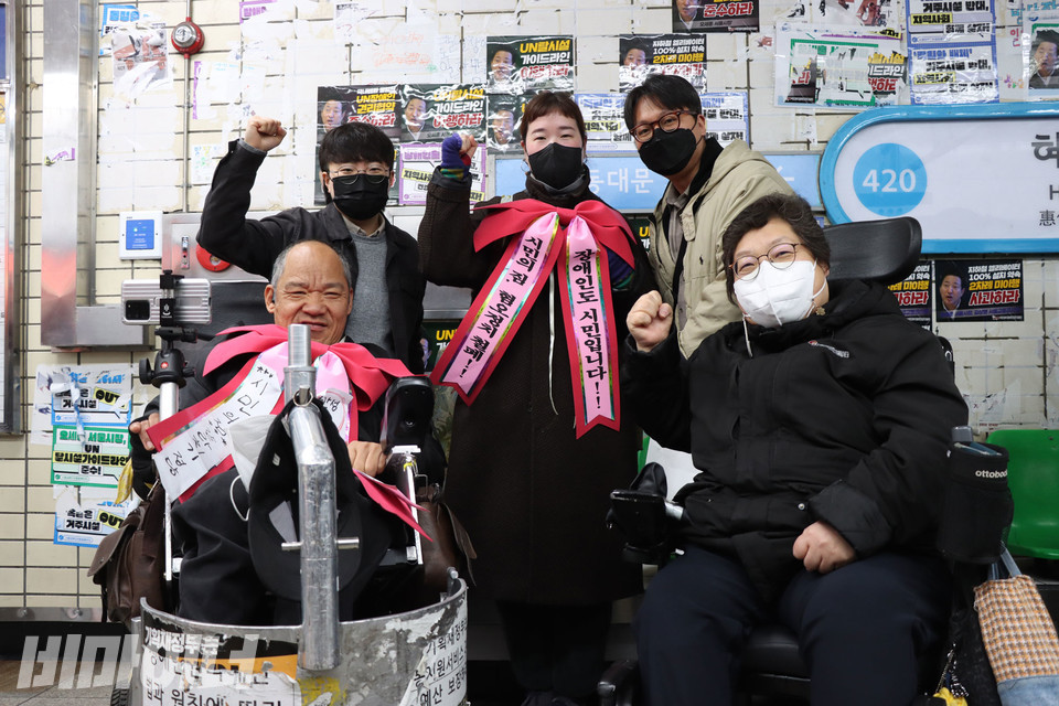 전국장애인차별철폐연대(아래 전장연) 활동가들은 2021년 12월 6일부터 혜화역 승강장 5-4(동대문역사문화공원역 방면)에서 장애인권리예산·입법 쟁취를 위한 선전전을 하고 있습니다. 전장연은 지난해 47차례 ‘출근길 지하철 탑니다’를 진행하고, 141일 동안(3월 30일~12월 1일) 177명의 장애인·비장애인 활동가들이 삭발 투쟁을 했습니다. 그러나 올해 장애인권리예산은 정부 예산안에 반영된 자연증가분을 제외하면, 국회에서는 고작 1.1%만 증액됐습니다. 기획재정부가 예산 증액에 반대했기 때문입니다.