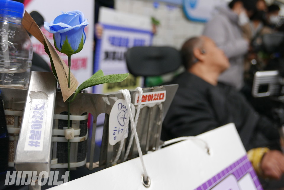 박경석 전장연 상임공동대표가 박예림 한여전 활동가를 붙잡는다. 오늘의 현수막이 되어달라고, 이제부터 사회자라고 한다. 갑작스러운 제안이지만 흔쾌히 함께한다. 승강장을 둘러보니 사람들의 곳곳에 연보라 장미가 함께하고 있다. 머리에, 휠체어에, 손에, 피켓 옆에.