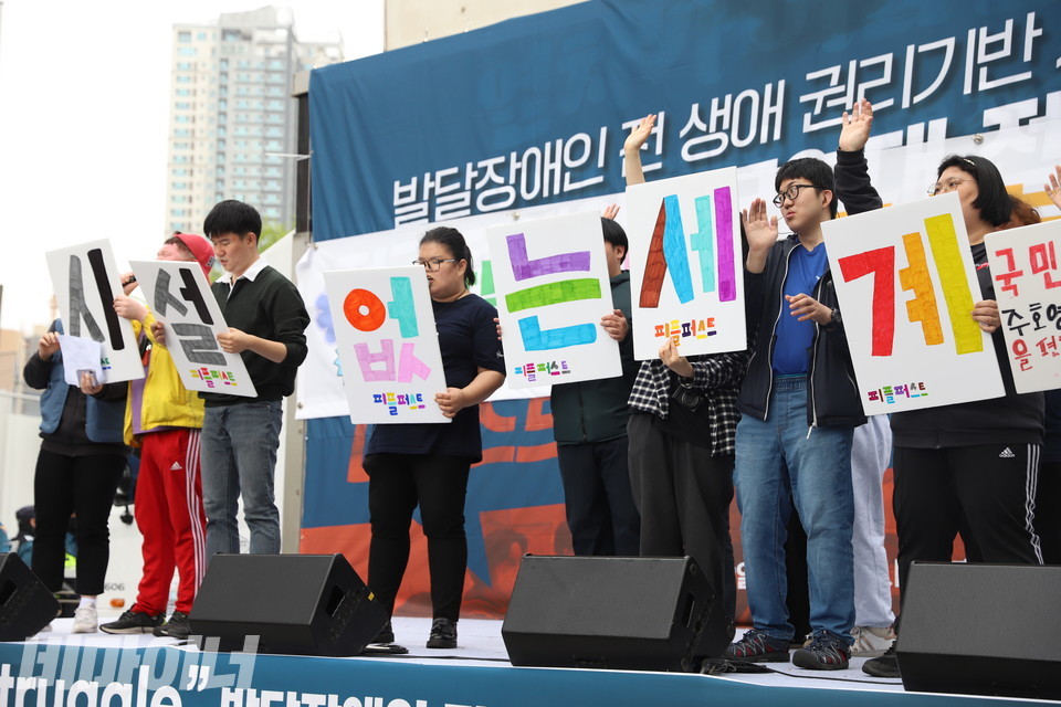 피플퍼스트서울센터 활동가들이 소녀시대의 ‘다시 만난 세계’를 개사한 노래 ‘시설 없는 세계’를 불렀다. “시설 이제 안녕~”하면서 손을 번쩍 들어 흔들자, 무대 앞 춤추던 사람들이 다 같이 환호한다.