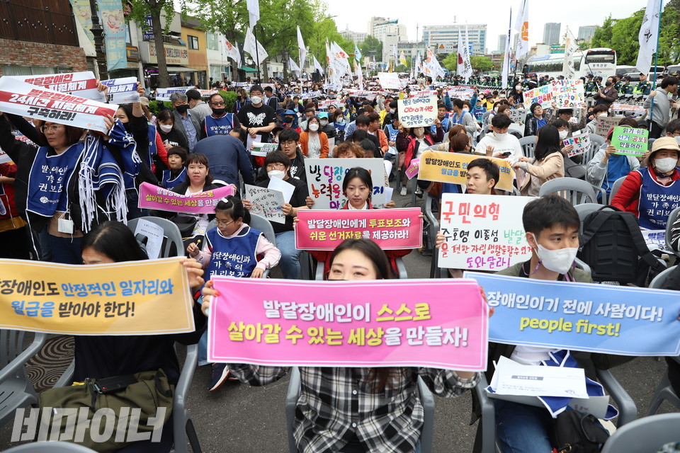 22번째 장애인차별철폐의 날, 발달장애인 권리보장을 촉구하는 목소리가 대통령실 앞에서 울려 퍼졌다. 한국피플퍼스트는 20일 오후 1시, 삼각지역 11번 출구 앞 야외무대에서 발달장애인 권리보장 촉구대회를 열었다.