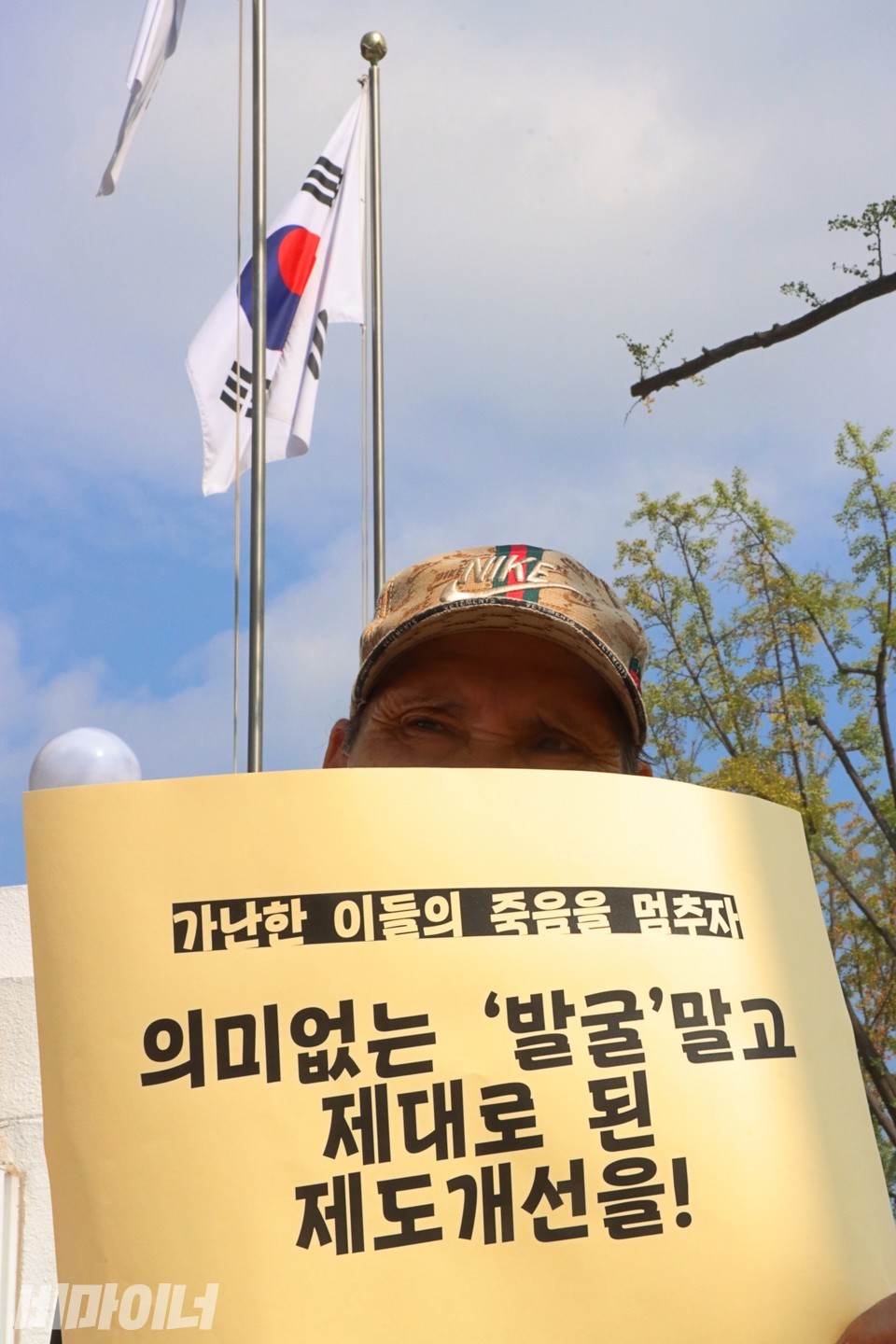 조 씨는 “생계급여로 생활하는 중인데 이 돈에서 병원비가 나가면 내 생활은 더 곤란해질 수밖에 없다. 결국 의료급여를 계속 받으려면 병을 가지고 살아야 한다. 돈 없는 사람들은 그냥 죽으라고 말하는 것과 같다”며 “가난한 사람들은 병원비가 무서워 병원을 못 가고, 약이 있어도 못 먹고 산다. 더는 죽이지 말라. 부양의무자기준을 완전 폐지하라”고 요구했다.