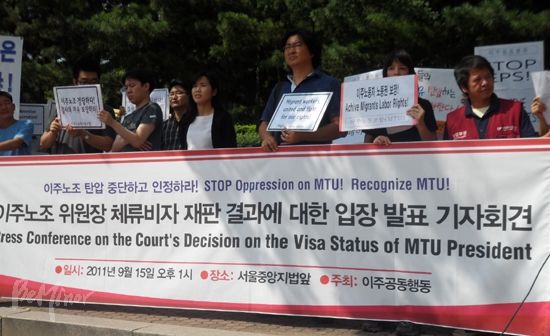 15일 오후 1시 미셸 위원장과 이주노동자 차별철폐와 인권·노동권 실현을 위한 공동행동(이주공동행동)은 법원 앞에서 행정법원의 판결을 환영하는 기자회견을 열었다.