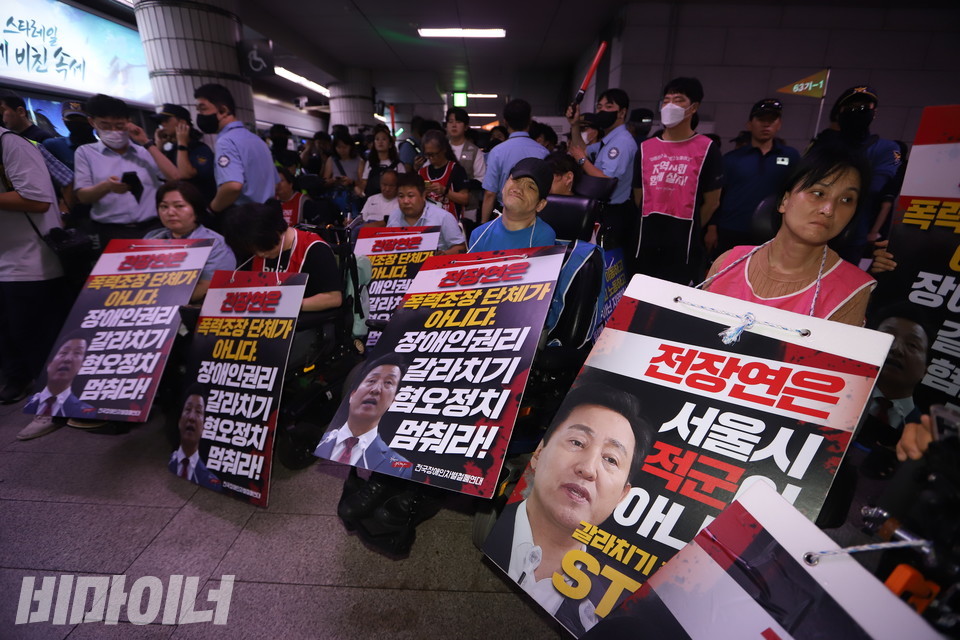 전장연 활동가들이 승강장에서 오세훈 서울시장을 규탄하는 피켓을 들고 있다.