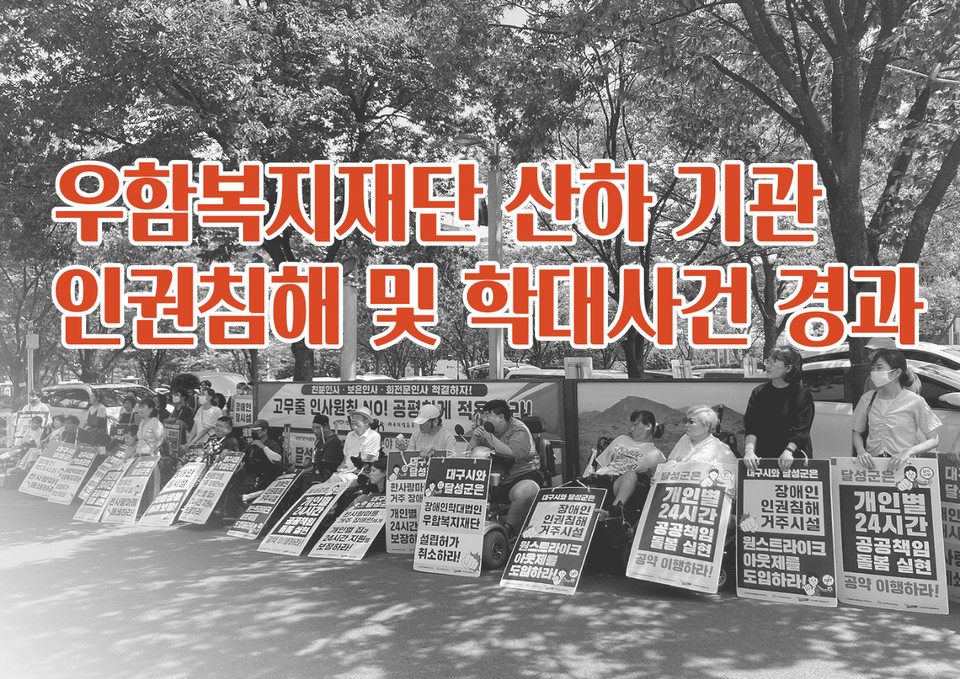 | 2023 | [대구시장애인권익옹호기관] - 우함복지재단 산하 이용시설인 발달장애인주간활동서비스제공기관(대표 이중하, 한사랑마을 원장과 동일인)에서도 발달장애인 학대 발생. - 4월, 이용시설을 다녀온 아들(자폐성장애인)의 불안과 스트레스 표출 등 행동이 평소와 다른 것을 느낀 어머니가 몸을 확인하자 신체 곳곳에 꼬집힌 자국과 멍이 있음을 확인. - CCTV를 직접 확인하자 해당 시설의 사회복지사가 아들의 가슴, 등, 턱, 볼 등을 강하게 꼬집거나 찌르는 모습을 확인. - 사회복지사가 장애인 이용자에게 가해 행위를 할 때 주변에 다른 직원들의 모습도 보였지만, 이를 만류하는 사람은 없었으며, 아들에게 가해를 한 사회복지사가 시설 밖에서 아들의 멱살을 잡고 뺨을 때리기도 했다는 다른 장애인의 증언 확인. - 문제제기를 하자 그제야 시설 측은 사실을 인정하며 장애인권익옹호기관에 학대 신고를 접수하였으며, 장애인권익옹호기관은 학대로 판정함. - 이 과정에서 가해 사회복지사는 별다른 처분 없이 사직함. |