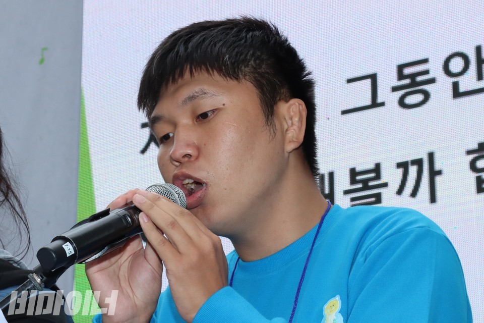 양재형 씨는 발달장애인의 자립을 위해 세 가지 지원이 필요하다고 말했습니다. △경제적 지원 △많은 활동지원서비스 시간 제공 △내 집 마련 지원 등을 정부에 요구했습니다. 양재형 씨가 “자립생활에 찬성하는 분들은 머리 위로 O를 그려 주세요. 반대하는 분들은 X를 그려 주세요”라고 하니 모두가 O를 그렸습니다. 이서윤 씨는 마이크를 잡고 “O가 맞는 것 같아요”라고 말했습니다.