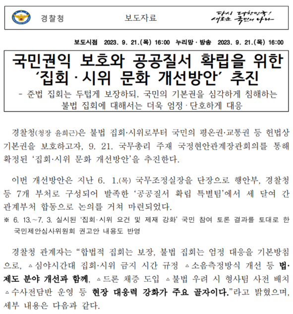 문재인 정부는 무려 3년 동안 코로나19를 이유로 집회시위를 전면 금지하는 행태를 보였지만, 윤석열 정부는 집회시위 대응에서 전임정부가 법집행 발동을 사실상 포기했다고 비판하며 이번 방안을 발표했다. 먼저 심야시간대 집회시위 전면금지, 소음기준 강화와 제한통고 처벌규정 신설, 집회 현수막 게시 기간 한정, 질서유지선 손괴 처벌 강화를 위한 법 개정 추진을 밝혔다. 한편 법 개정을 하지 않아도 경찰이 휘두르는 재량권을 통해 집회신고 단계에서부터 제한·금지 통고를 적극적으로 하고 특히 출퇴근 시간대 집회를 금지하겠다고 밝혔다. 현장에서 해산명령과 직접해산 조치를 강화 적용하고 집회시위 수사전담반을 신설하며 손해배상 청구도 활용하겠다는 계획이다. 드론채증 도입을 통한 집회시위 참여자에 대한 감시 강화도 밝혔다. 경찰의 권한을 극대화해 집회시위를 시작부터 끝까지 경찰의 자의적 기준에 따라 강력하게 관리·통제하겠다는 것이다.