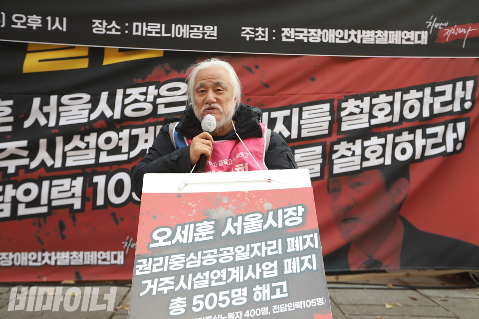 “오세훈 서울시장은 권리중심공공일자리의 내년 예산을 0원으로 만들었습니다. 어이가 없습니다. 일자리가 없어지면 저는 수입이 0원입니다. 권리중심공공일자리 대신 서울시가 제시한 일자리는 우리 중증장애인들이 할 수 없는 일들만 있습니다. 중증장애인들만이 할 수 있는 권리중심공공일자리를 다시 만들 때까지 우리는 열심히 투쟁할 것입니다. 오세훈 시장님, 우리 목소리를 들어주십시오.”