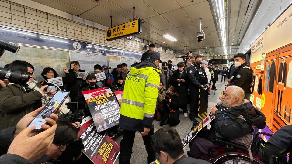 전장연은 평소처럼 기자회견을 진행하고 있었다. 지하철 출입문을 등진 채, 박 대표는 벽 쪽에 서 있는 사람들을 마주 보며 발언하고 있었다. 전장연 페이스북 라이브 영상을 보면, 기자회견이 35분 정도 지났을 때, 사람들과 박 대표 사이로 방패 든 경찰이 밀고 들어왔다. 박 대표는 경찰 등 뒤에 혼자 고립되었다. 경찰이 연행을 시도하자 박 대표는 경찰에게 “연행하는 이유가 무엇인가”라며 재차 물어봤지만 정확한 답을 듣지 못했다.