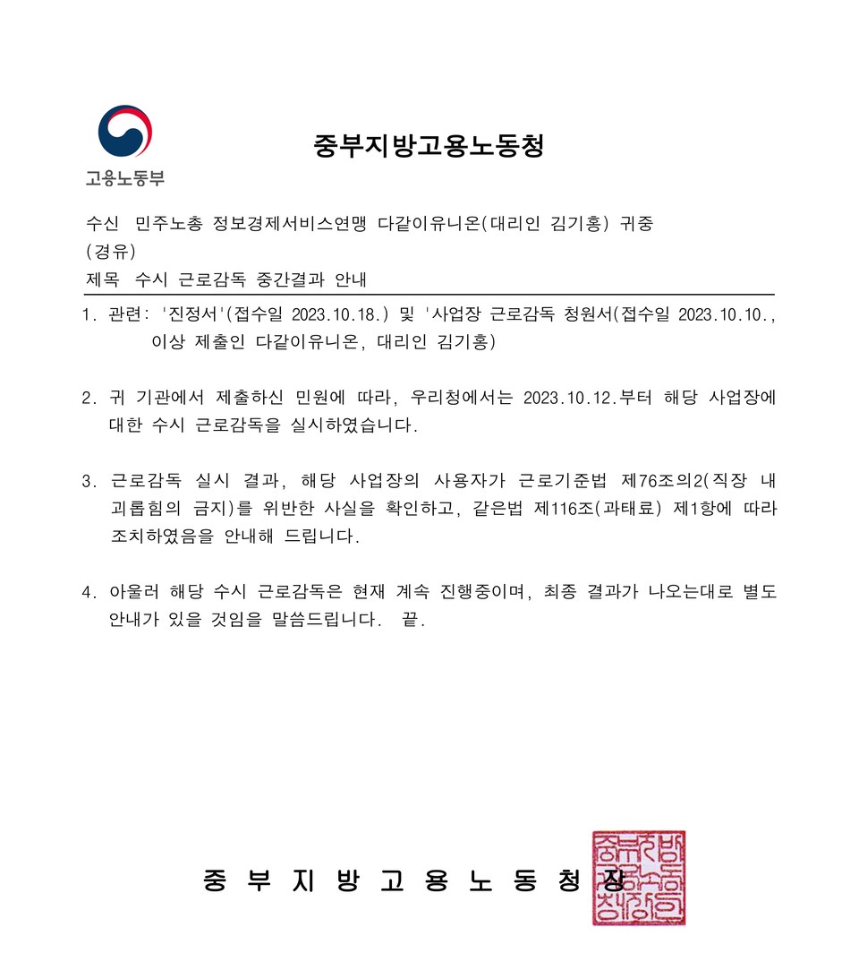 고용노동청은 “근로감독 실시 결과, 해당 사용자가 근로기준법 제76조의2(직장 내 괴롭힘의 금지)를 위반한 사실을 확인하고, 같은 법 제116조(과태료) 제1항 따라 조치”하였다면서 “해당 수시 근로감독은 현재 계속 진행 중이며 최종 결과가 나오는 대로 별도 안내가 있을” 예정이라고 밝혔다.
