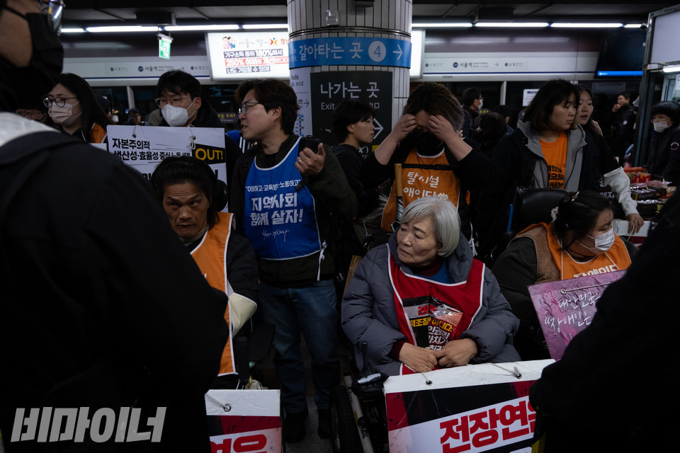 420장애인차별철폐공동투쟁단(아래 420공투단)이 26일 오후 2시, 서울역 1호선 승강장(시청 방향)에서 ‘시민불복종행동-열차 타는 사람들’을 진행하고 있다.