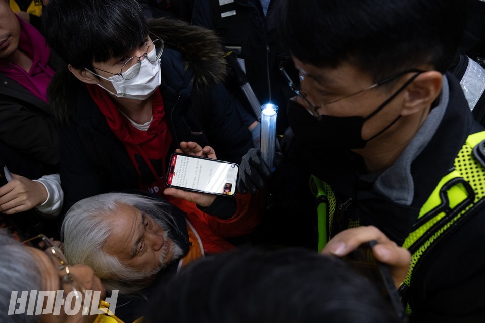 박경석 전국장애인차별철폐연대 상임공동대표가 ‘국제앰네스티 언론상 특별상’ 시상식에 참여하기 위해 지하철에 탑승하려고 하나 서울교통공사와 경찰이 막아서고 있다.
