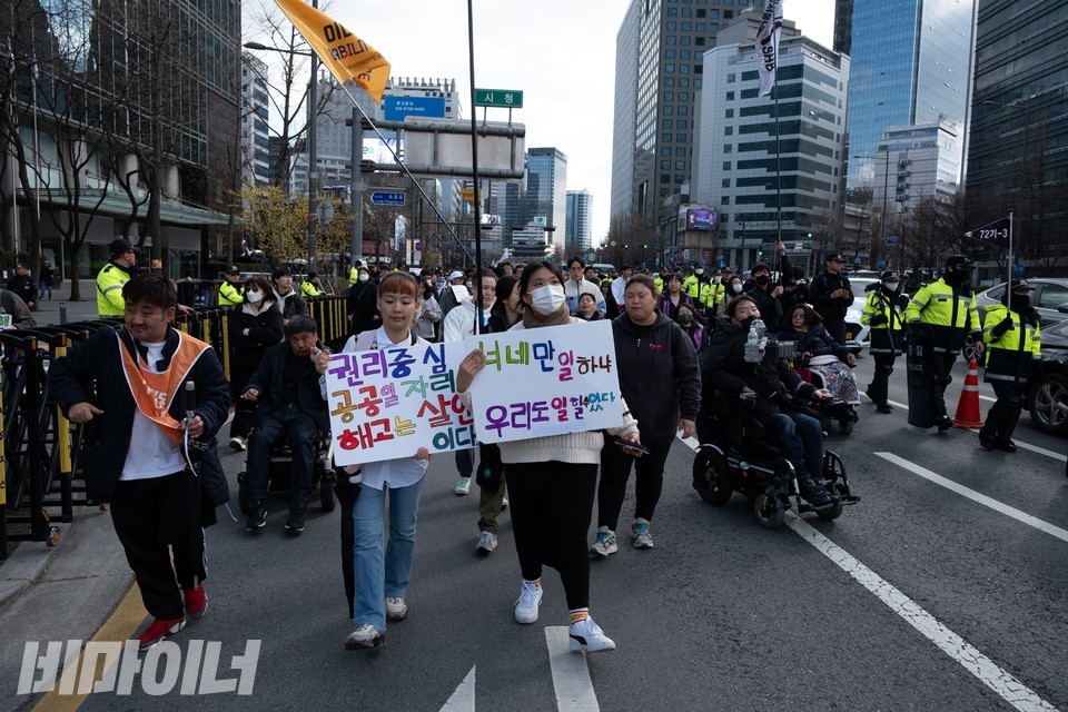 서울시청에 도착해서는 326전국장애인대회(420공투단 출범식)를 진행했다. 이들은 4월 10일 총선을 앞두고 ‘장애인도 이동하고 교육받고 노동하며 감옥 같은 거주시설이 아니라 지역사회에서 함께 살아갈 권리’를 요구했다.