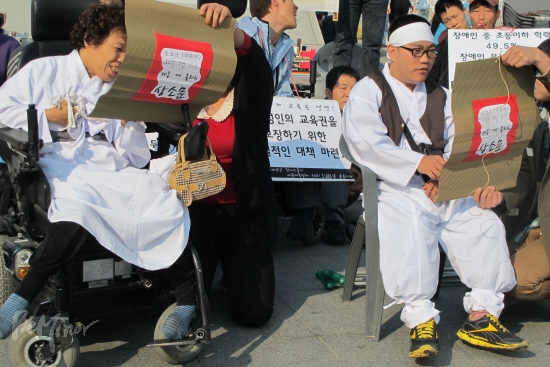 ![]() ▲세종대왕에게 상소문을 올리고 있는 노들장애인야학 장애경 씨와 이준수 씨. |