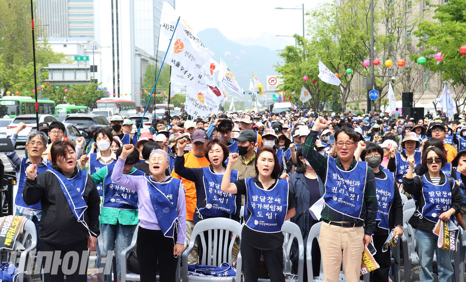 윤종술 부모연대 대표는 “정부는 올해 6월부터 통합돌봄서비스를 시작한다고 하나 (이용 가능한 인원이 워낙 적어) 18만 명의 성인발달장애인들은 여전히 갈 곳이 없다”면서 “중증발달장애인이 자립할 수 있는 권리를 가질 때까지 투쟁하자”고 외쳤다.