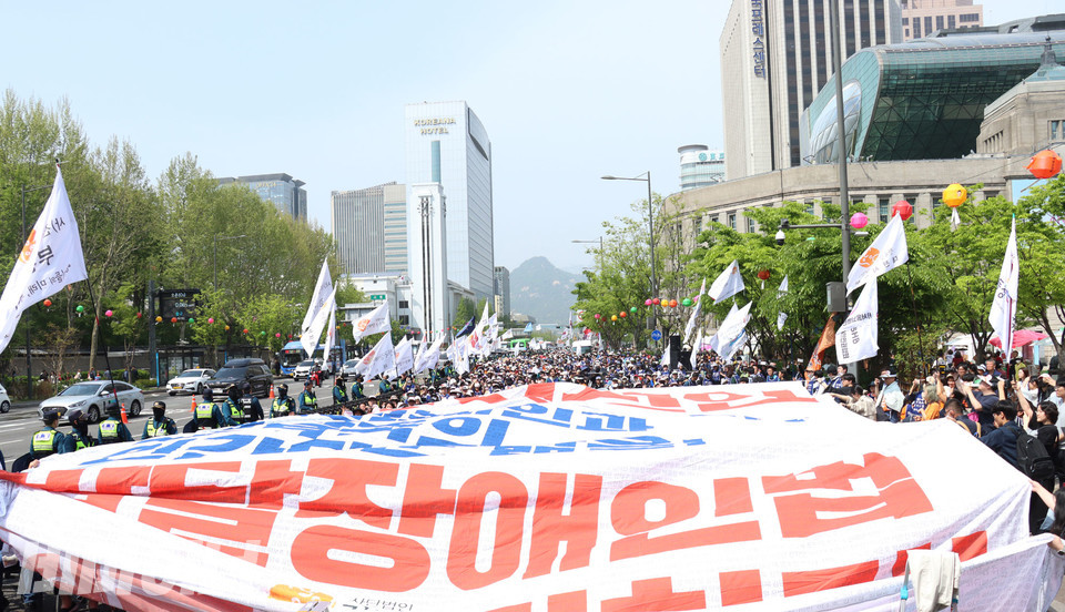 ‘장애인차별철폐의 날’을 맞아, 발달장애인과 그 가족이 지역사회에서 인간답게 살아갈 수 있도록 ‘발달장애인 권리보장 및 지원에 관한 법률’(아래 발달장애인법) 전면 개정을 국회에 요구했다. ‘발달장애 국가책임제 도입’이라고 적힌 파란색 몸피씨를 입은 1000여 명의 장애부모들이 서울시청 서편 2차선 도로를 가득 메웠다.