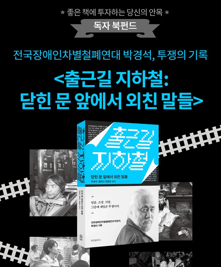 출근길 지하철 투쟁을 벌이는 전국장애인차별철폐연대(아래 전장연) 박경석 대표의 투쟁의 기록을 담은 책 《출근길 지하철: 닫힌 문 앞에서 외친 말들》(위즈덤하우스)이 오는 6월 26일 출간된다. 출간에 앞서 출판사는 알라딘 북펀딩으로 홍보에 나섰다.