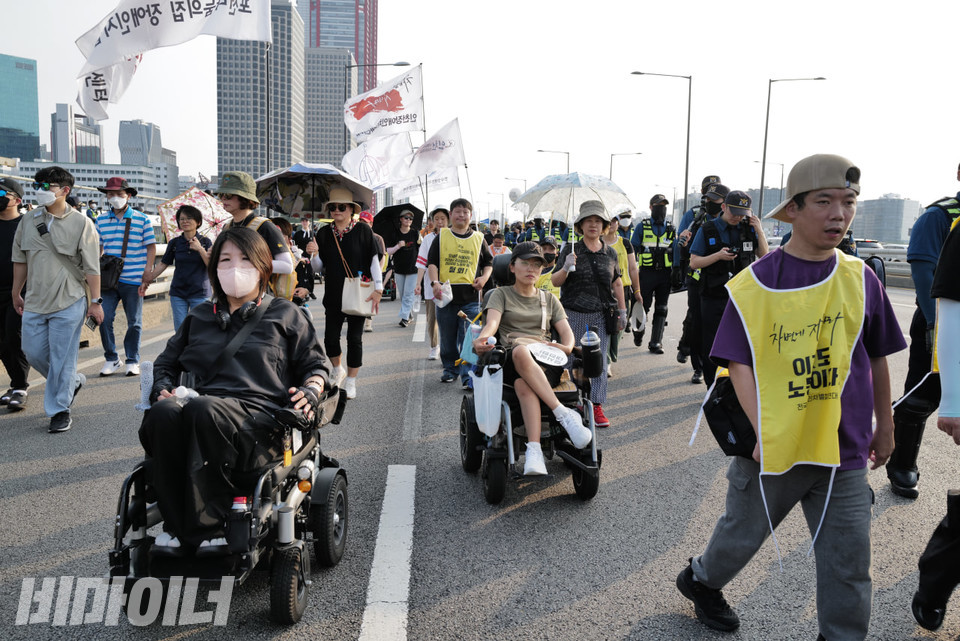 22대 국회에 1년 내 장애인권리법안 입법을 촉구하며 도로를 점거한 장애인 활동가들. 사진 최인기