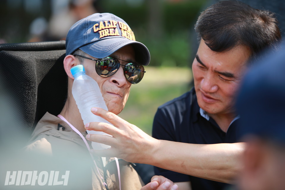 한 장애인 활동가가 불볕더위를 식히기 위해 얼음물을 뺨에 대고 있다. 사진 최인기