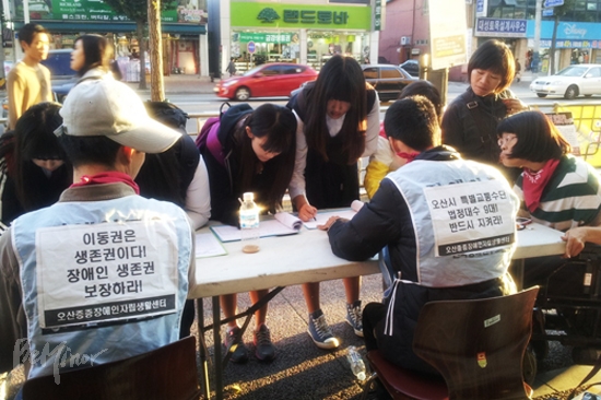 ![]() ▲시민으로부터 '장애인 및 교통약자 이동권 보장 촉구 서명'을 받는 모습. ©오산중증장애인자립생활센터 |