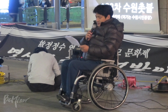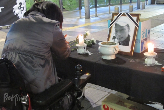 ![]() ▲정정수 열사를 추모하기 위해 수원역 광장에 모인 장애인활동가들. |