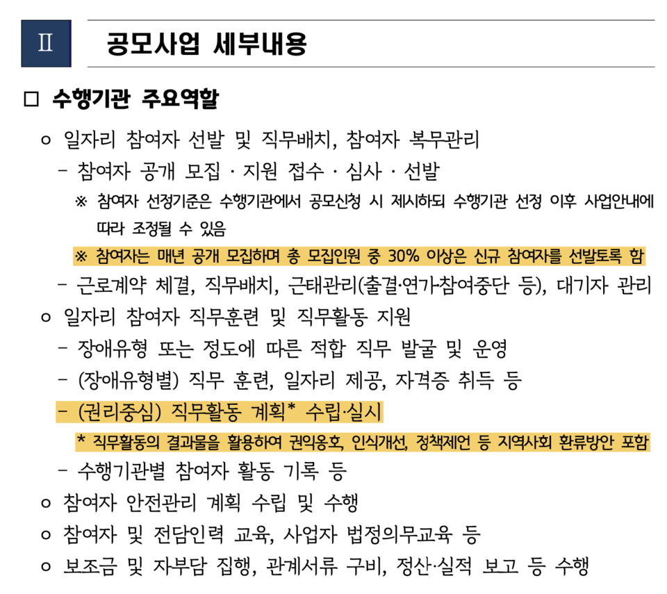 그럼에도 경기도는 장애인 노동자들이 문제로 지적한 방식을 답습하는 내용의 공고문을 냈다. 우선 경기도는 올해부터 권리중심공공일자리 사업을 경기복지재단 산하의 ‘경기도장애인복지종합지원센터 누림(아래 누림센터)’에 위탁했다. 따라서 기관들은 누림센터의 심사를 받게 됐다.