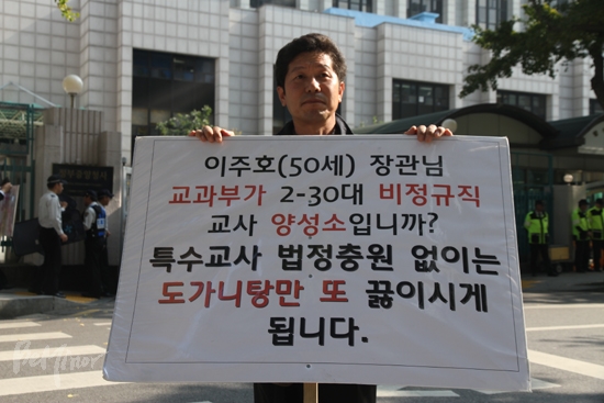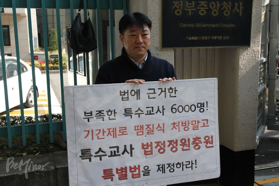 2일 정부중앙청사 후문 건너편 인도에서 이른 11시부터 늦은 1시 30분까지 1인 시위에 나선 나사렛대 중등특수교육학과 김형일 교수는 “사명감을 가지고 특수교사가 되어 소중한 삶을 살기 위해 특수교육과에 지원한 학생들이 임용시험을 볼 기회조차 주어지지 않는다는 사실에 참담해하고 있다”라고 전했다.
