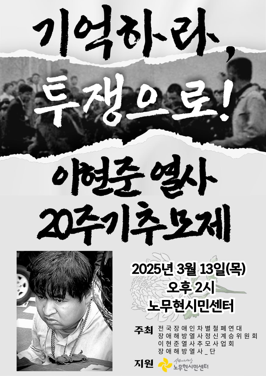장애해방운동가 이현준 열사의 20주기 추모제가 13일 오후 2시 노무현시민센터 다목적홀에서 열린다.