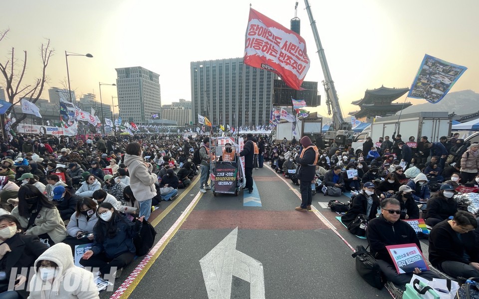 종로구 안국동 사거리에는 주최 측 추산 약 3만 명의 인파가 ‘윤석열 탄핵’을 외치며 운집해 있었다. 장애인들은 질서정연하게 운집한 시민 한가운데에서 온몸으로 기었다. 간간이 “누구야?”, “전장연이래, 전장연.”, “왜 저래?” 하는 목소리가 들려오기도 했다.