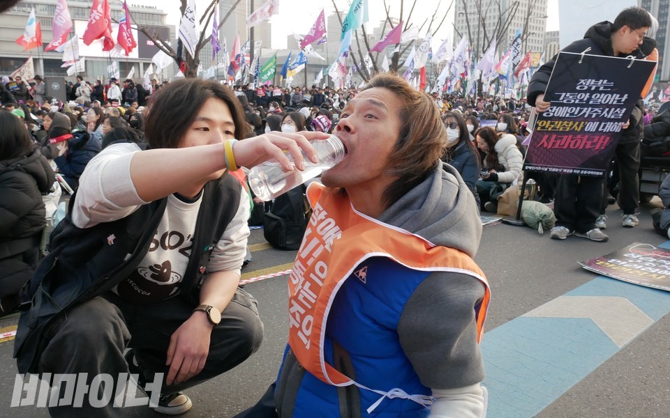 장애인이 내려온 휠체어 한 대는 물을 실어 나르는 ‘물차’가 됐다. 체력이 떨어진 장애인들은 아스팔트 바닥에 온몸을 늘어뜨려서 쉬다가, 물 한 모금 마시고 다시 힘을 내서 기어가기를 반복했다. 상의 가슴께가 바닥 먼지로 범벅이 되다가 나중엔 구멍이 나기도 했다.