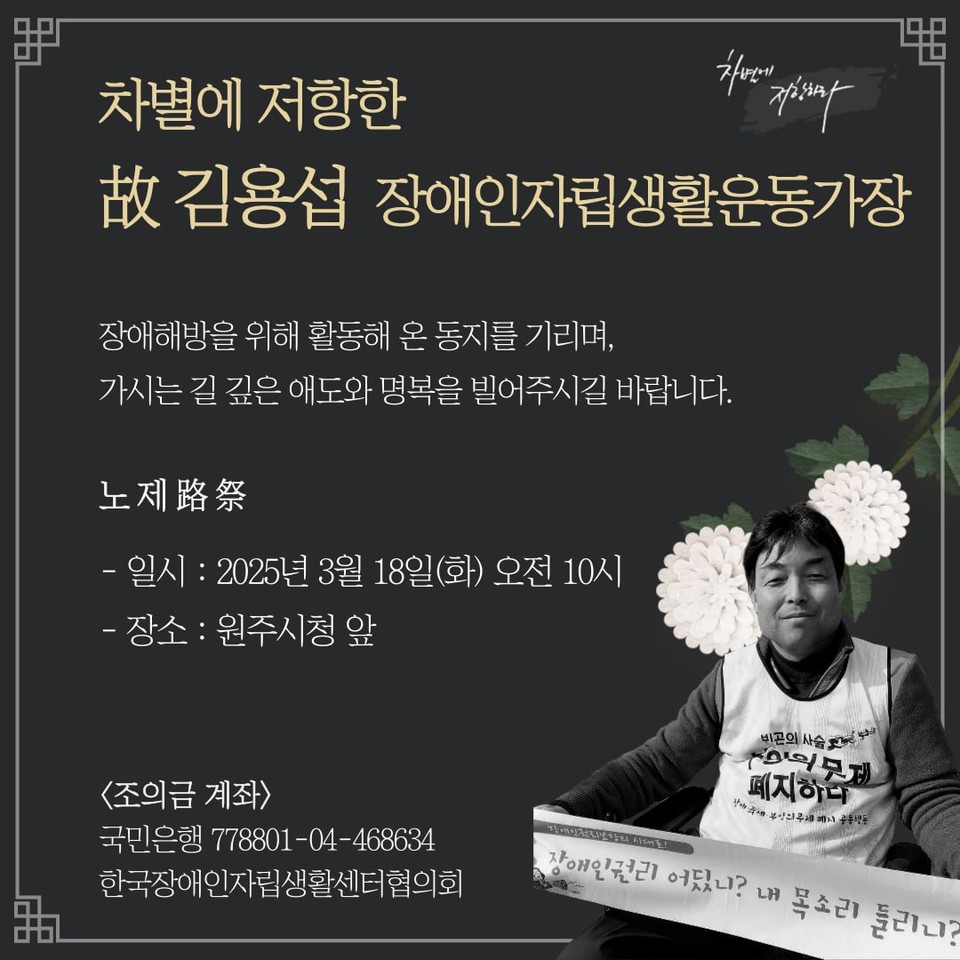 장례는 ‘장애인자립생활운동가장’으로 치러질 예정이다. 한국장애인자립생활센터협의회 등 장애계는 오는 18일 오전 10시, 원주시청 앞에서 ‘차별에 저항한 故 김용섭 장애인자립생활운동가장’을 치른다.