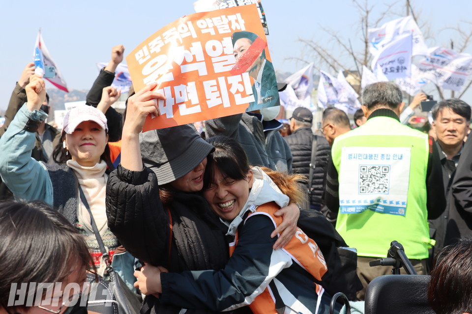 12월 3일 계엄 당시 국회를 지켰던 장애인들이 4월 4일, 파면 선고가 내려지는 순간에도 헌법재판소 인근 안국역에서 자리를 지켰다. 헌법재판소의 결정을 초조하게 기다리던 장애인들은 파면이 선고되자 크게 환호했다. 서로 부둥켜안고 눈물을 흘리는 이들도 있었다. 오늘의 승리를 만들어내느라 고생했다며 서로를 격려하기도 했다.
