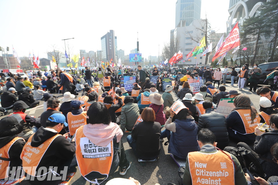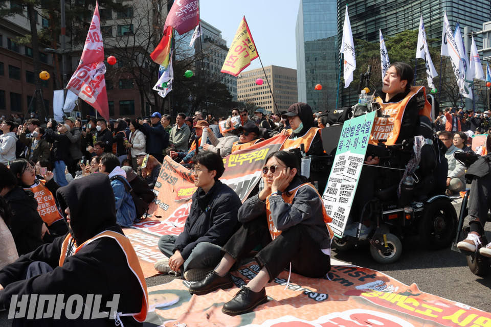 결의대회에 참석한 장애계 활동가들이 도로에 앉아 있다. 사진 김소영