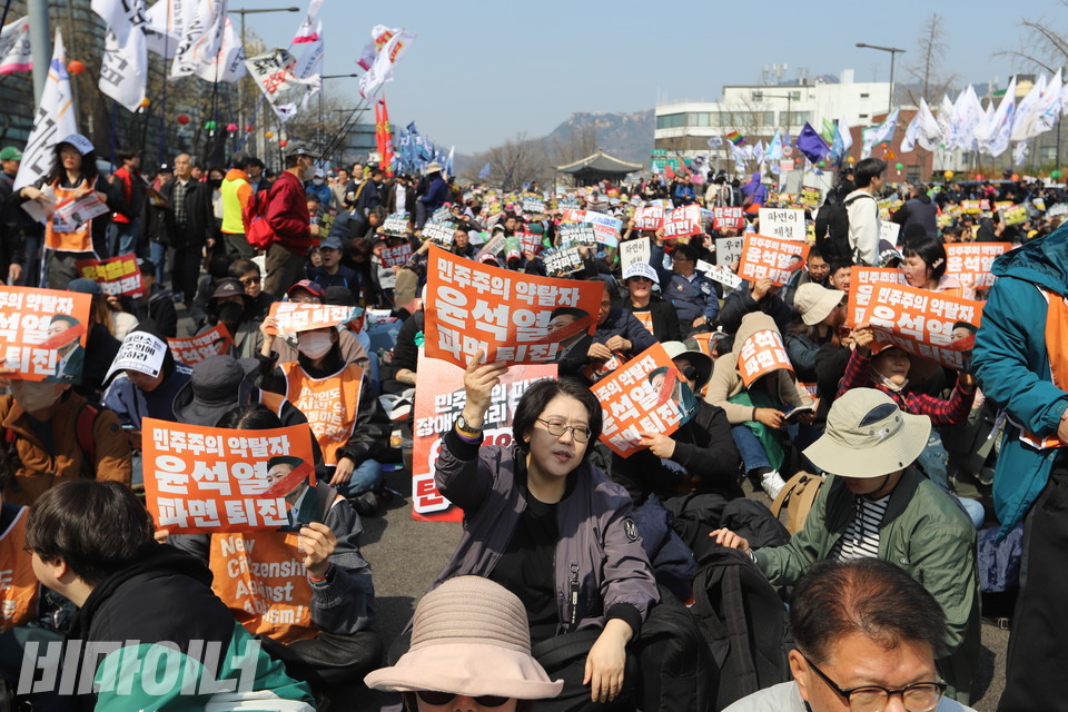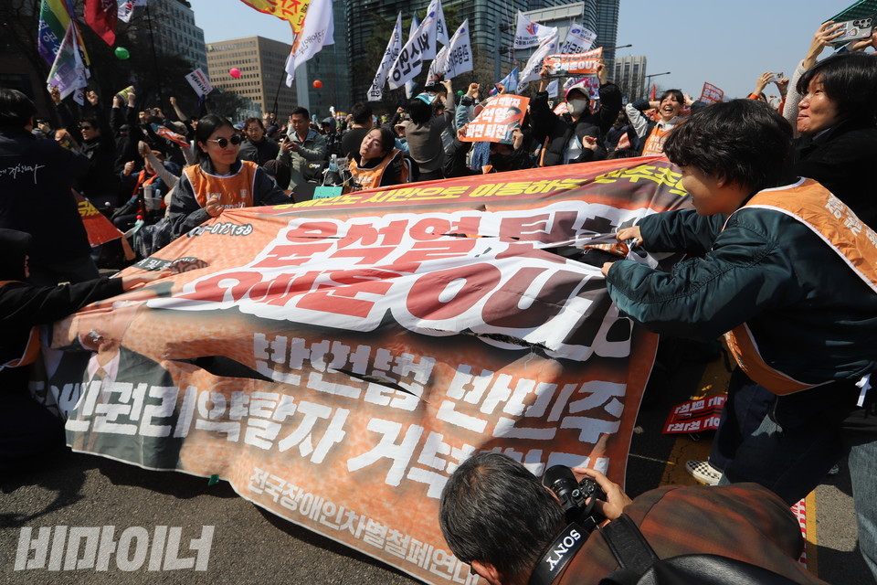 헌법재판소가 인용 결정을 발표하자마자 활동가들이 “윤석열 탄핵 오세훈 OUT”이라고 쓰인 큰 현수막을 찢고 있다. 사진 김소영