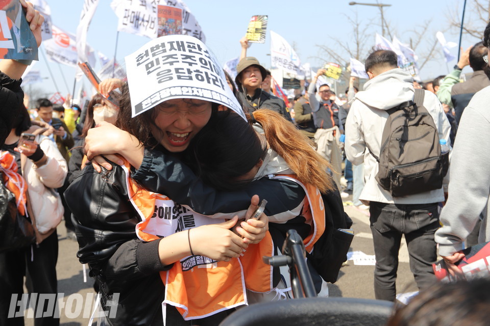 활동가와 참여자들이 헌법재판소의 탄핵 인용 결정을 듣고 두 팔을 번쩍 들며 기뻐하고 있다. 사진 김소영