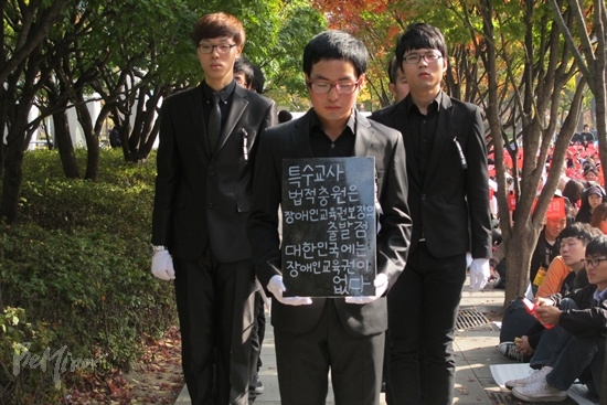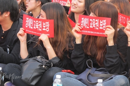 ![]() ▲결의대회에 참석한 특수교육과 학생들이 '장애인교육권보장'이라는 손펼침막을 들고 연대발언을 경청하고 있다. |