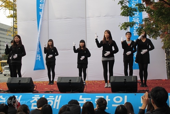 ![]() ▲극동대학교 특수교육과 학생들이 수화공연을 펼치고 있다. |