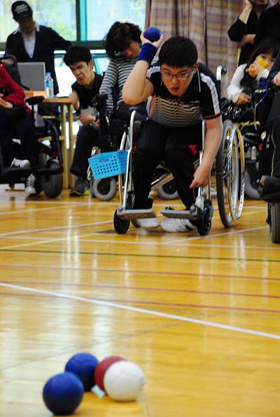 ▲보치아 경기는 표적구와 상대편 공의 위치를 보고 집중하여 공을 던져야 한다