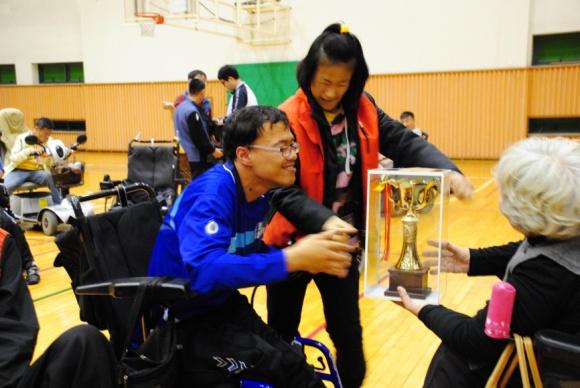 ▲박명애 대표로부터 트로피를 전달받는 경산장애인자립생활센터 선수들