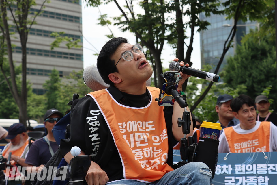 19일 오후 2시 광화문광장에서 열린 장애인 접근권 침해 국가책임 집단소송 ‘김순석들’ 기자회견에서 서권일 인천장애인자립생활센터협의회 대표가 발언하고 있다.