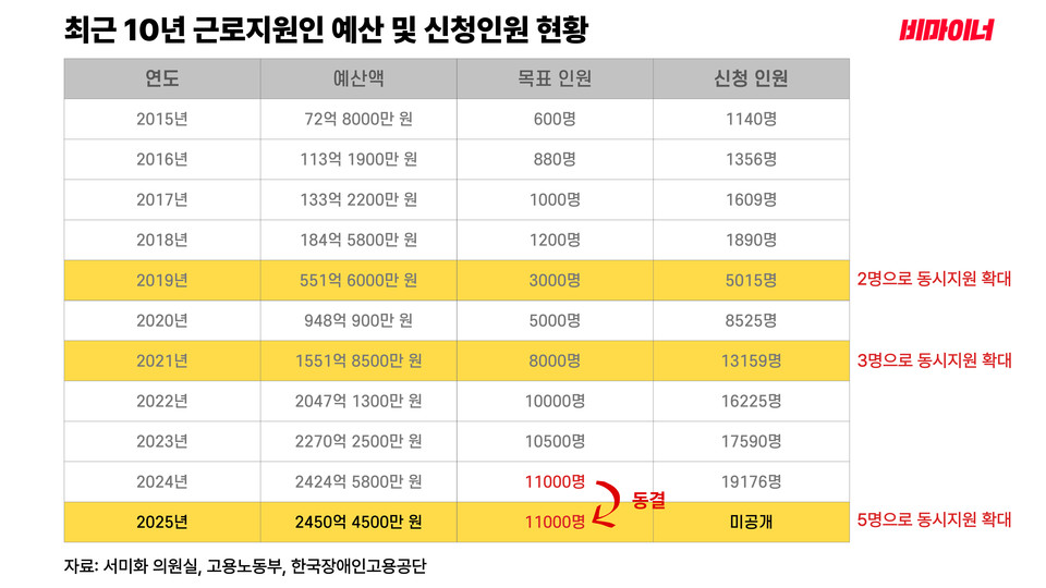 근로지원인 예산은 언제나 턱없이 부족했다. 비마이너가 공단으로부터 받은 자료, 매해 고용노동부 기금운용계획 각목명세서, 공단이 국회 보건복지위원회 소속 서미화 더불어민주당 국회의원실에 제출한 자료를 정리하면 10년간 근로지원인 예산은 다음과 같다.