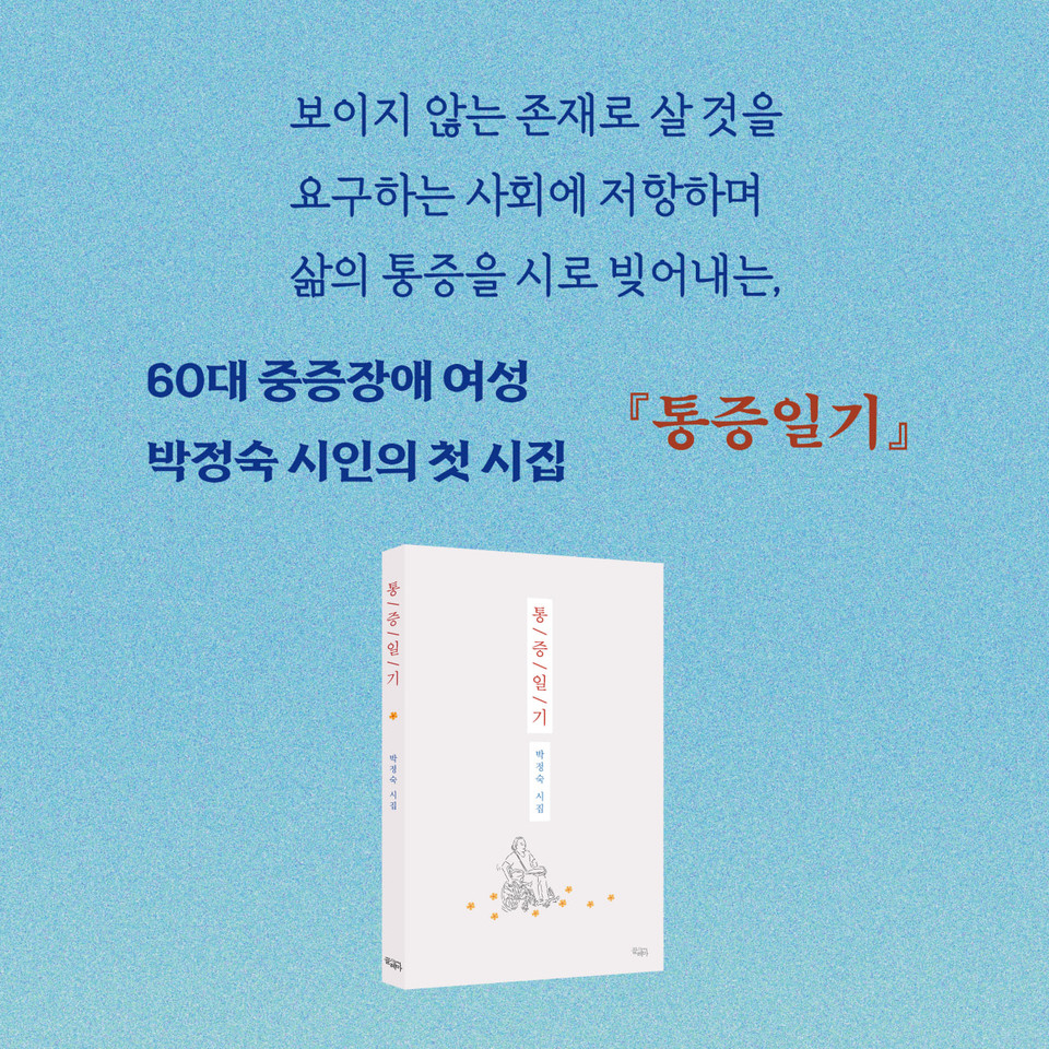 “배제와 차별, 학대와 혐오가 만연한 세상에 살아남은 생존자, 나는 60대 장애 여성”이라고 자신의 정체성을 밝히는 박정숙 시인. 중증장애인으로서 존재를 드러내고 투쟁하는 삶을 선택해 온 자신의 여정을 시로 빚어낸 박정숙의 첫 시집 ‘통증일기’가 출간됐다.