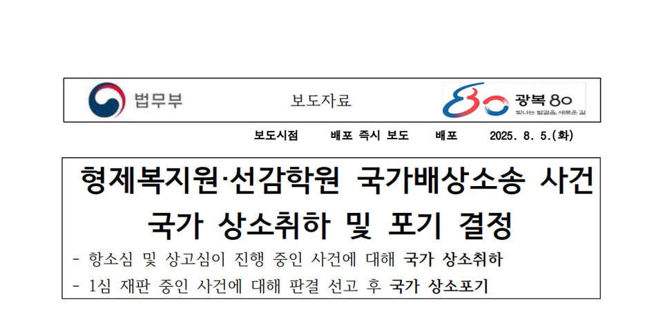 법무부는 5일 “형제복지원·선감학원에 강제 수용되었던 피해자들의 신속한 권리구제를 위해 원칙적으로 국가가 제기한 상소를 일괄 취하하고, 향후 선고되는 1심 재판에 대해서도 추가적 사실관계 확정이 필요한 사건 등 예외적인 경우 외에는 상소를 포기하기로 했다”고 밝혔다.
