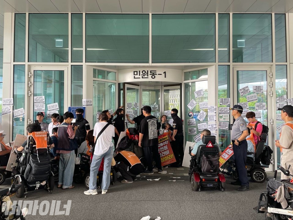 현재 장애인들은 민원 1동 현관에 권리스티커를 부착하고 경찰과 30분 넘게 대치를 이어가고 있다.