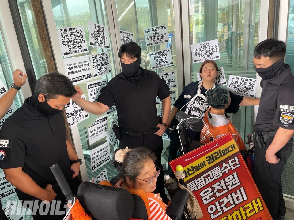 이들은 정부의 내년도 예산안 국회 제출을 앞두고 기획재정부에 특별교통수단(장애인콜택시), 장애인자립생활센터 지원 확대 등 장애인권리예산 요구안을 제출하러 왔으나 이들이 민원 1동에 도착하기 전부터 행안부 기동대, 청원경찰 등이 출입문을 봉쇄하고 있었다.